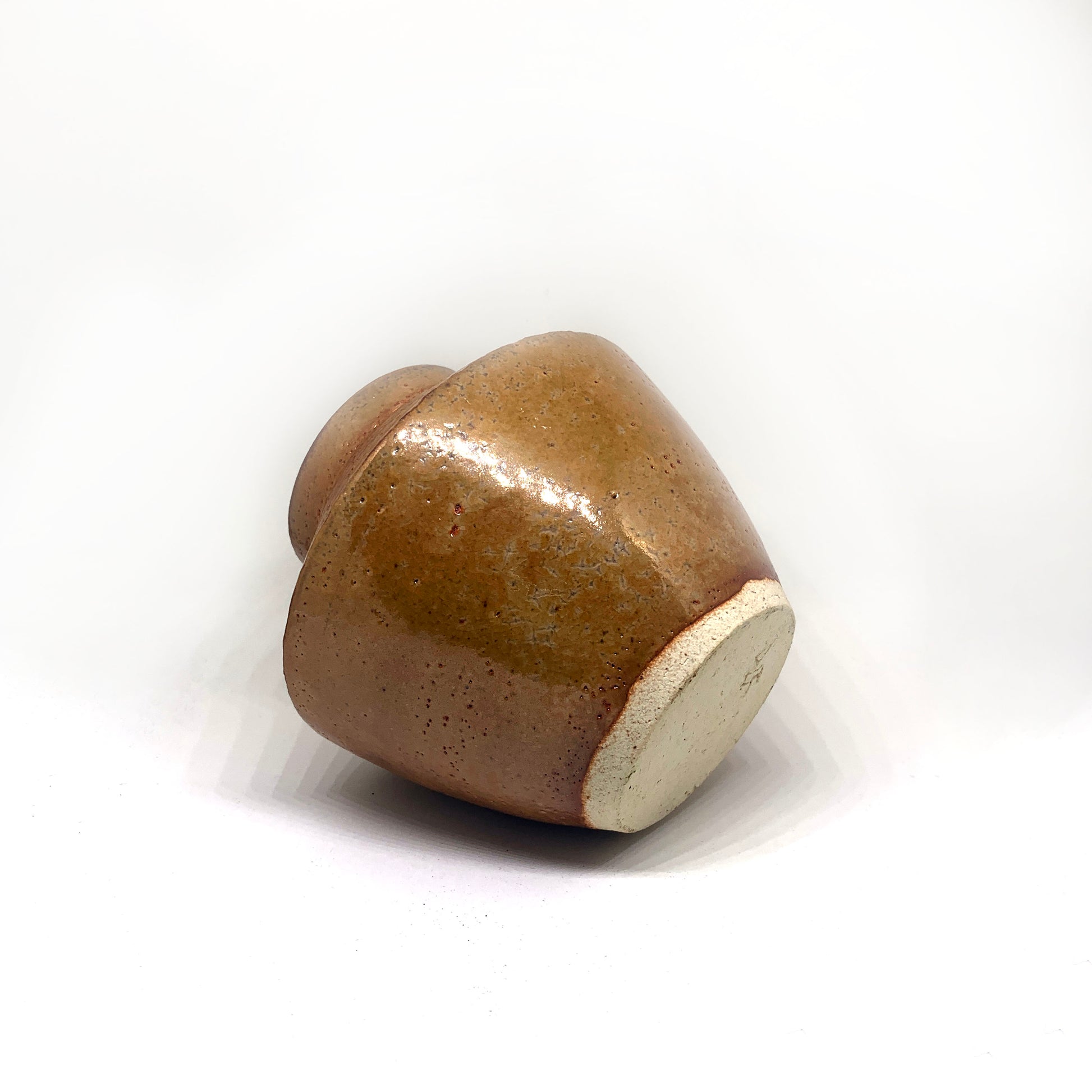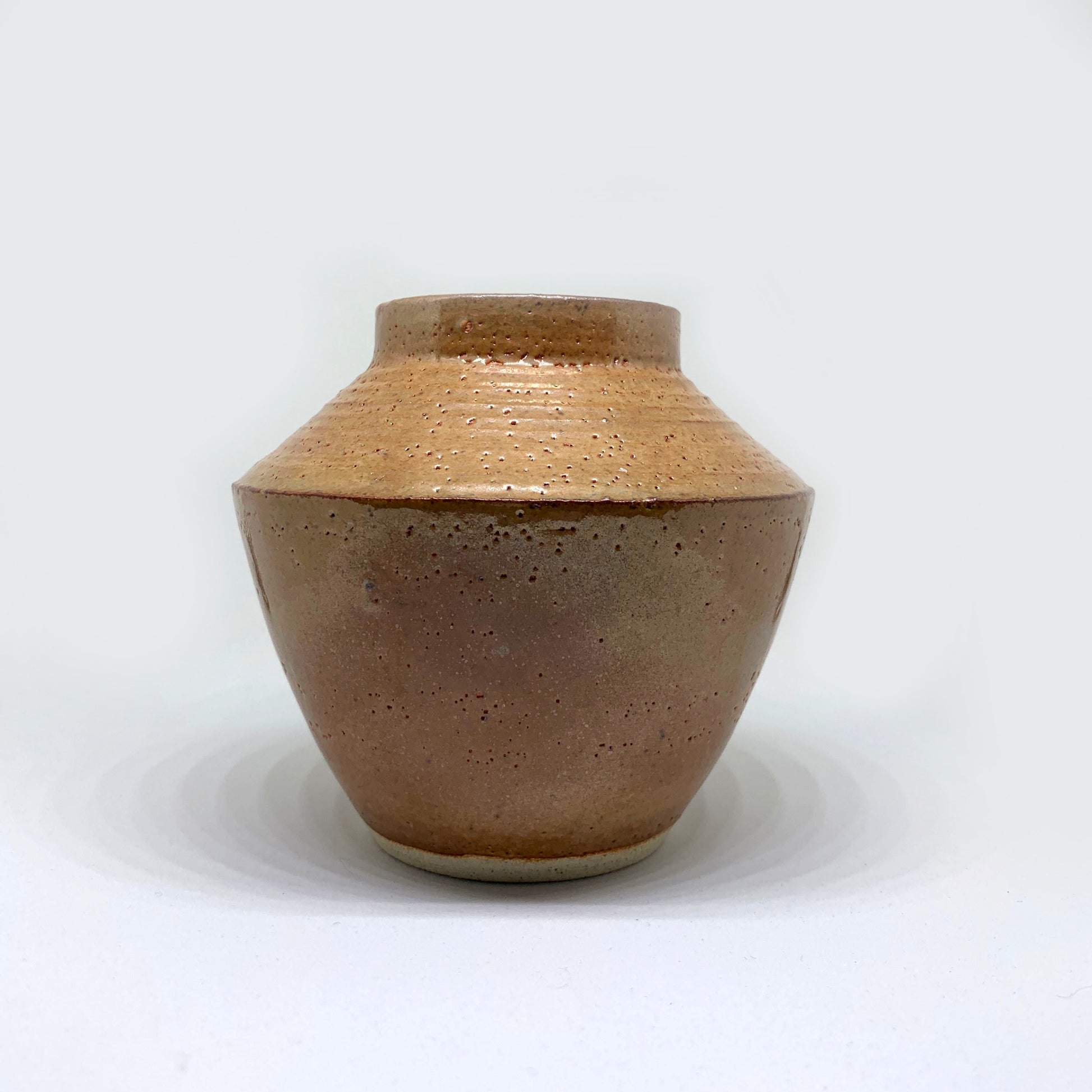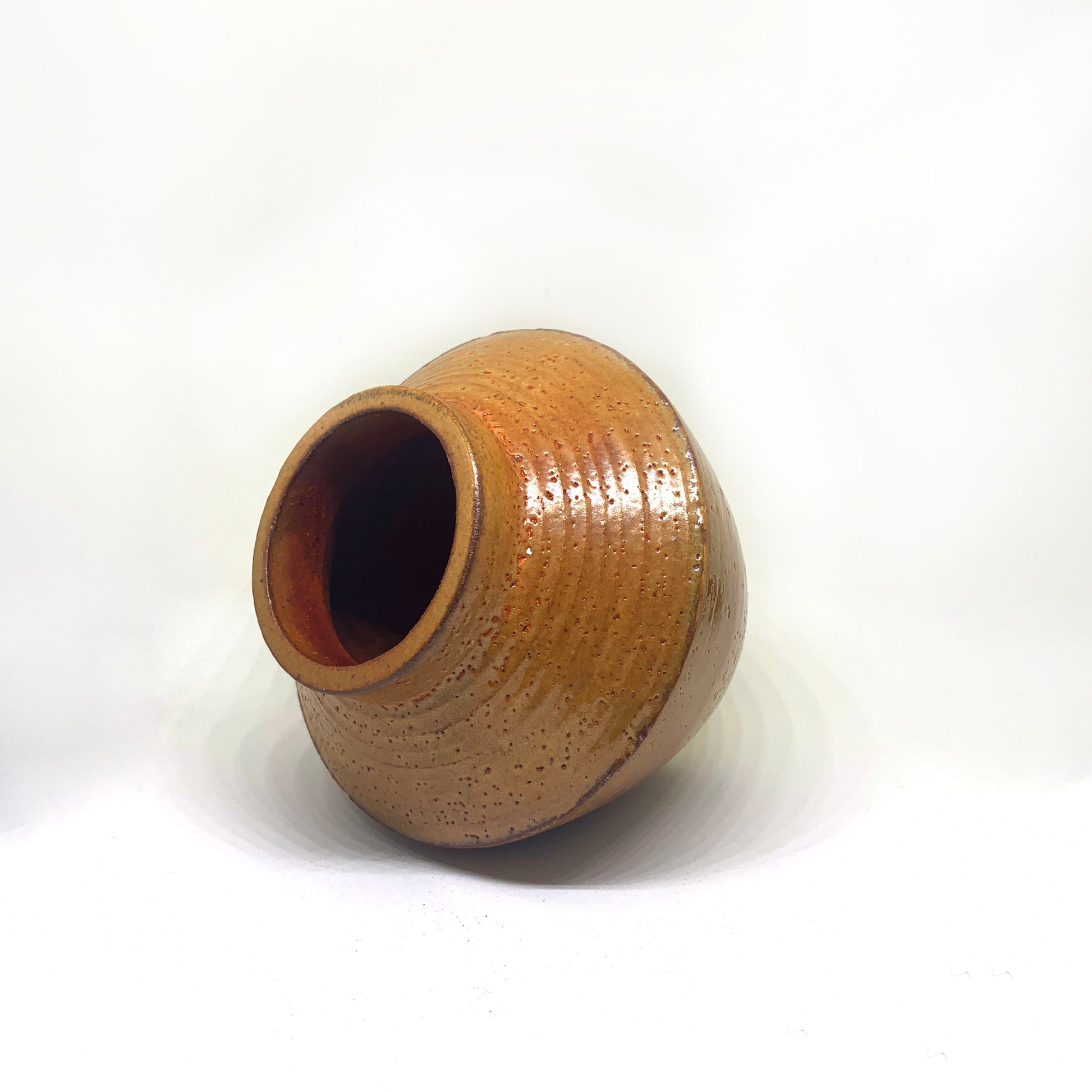 A hand-made clay vase with angular effects glazed with Malcom Davis Shino. This piece is one-of-a-kind, never to be reproduced.