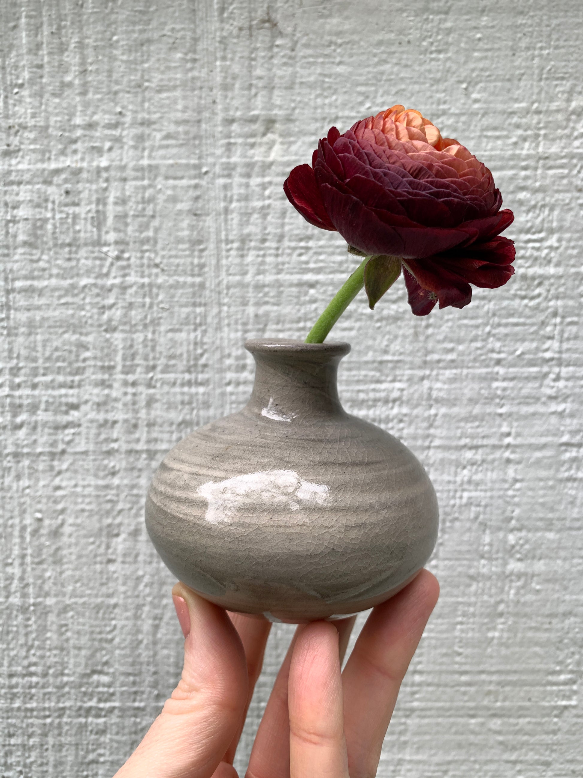 A hand-made marbled clay bud vase glazed in Transparent 1200. This piece is one-of-a-kind, never to be reproduced.