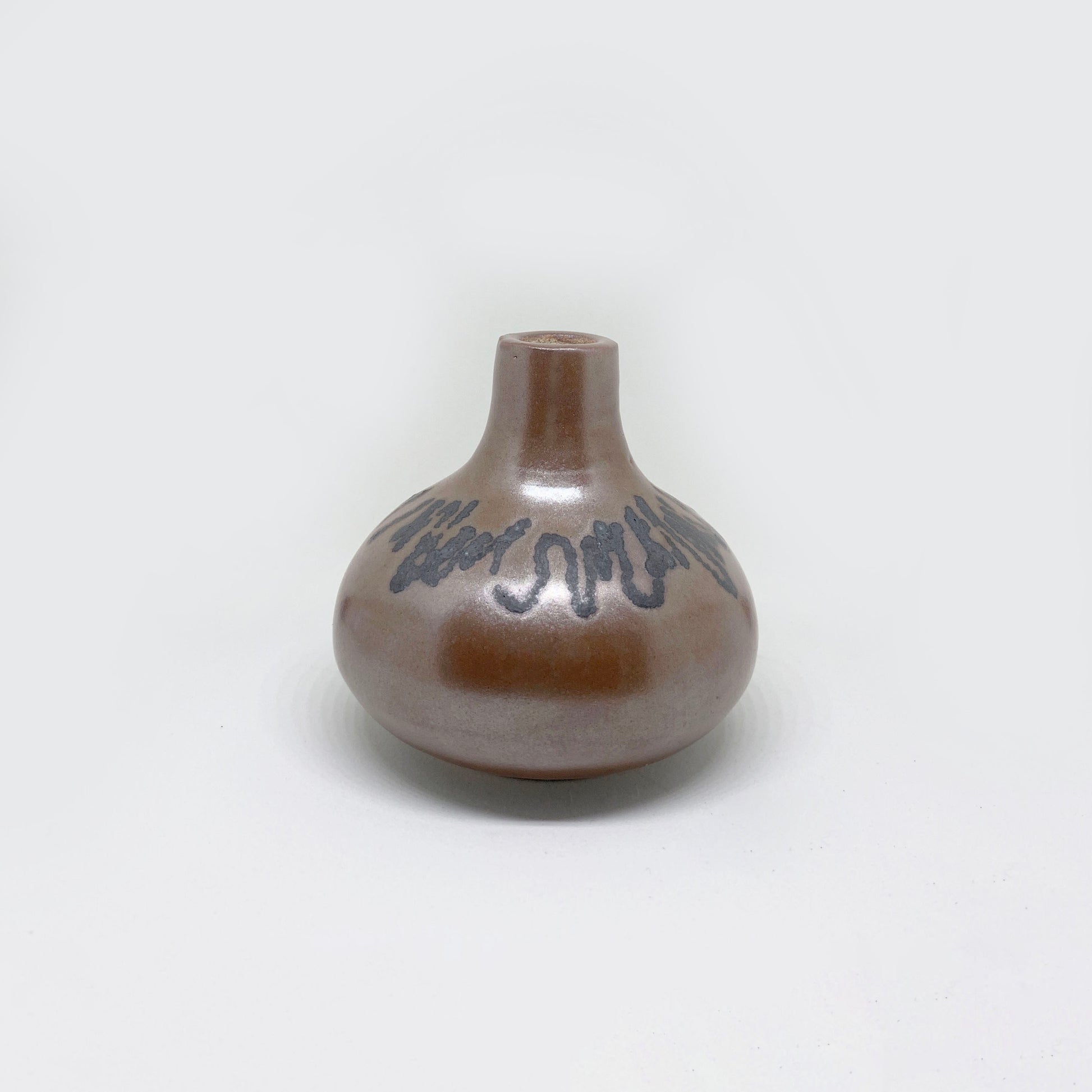 A hand-made clay bud vase glazed with Mustard Shino and an idiosyncratic scribble of Sage Black. This piece is one-of-a-kind, never to be reproduced.