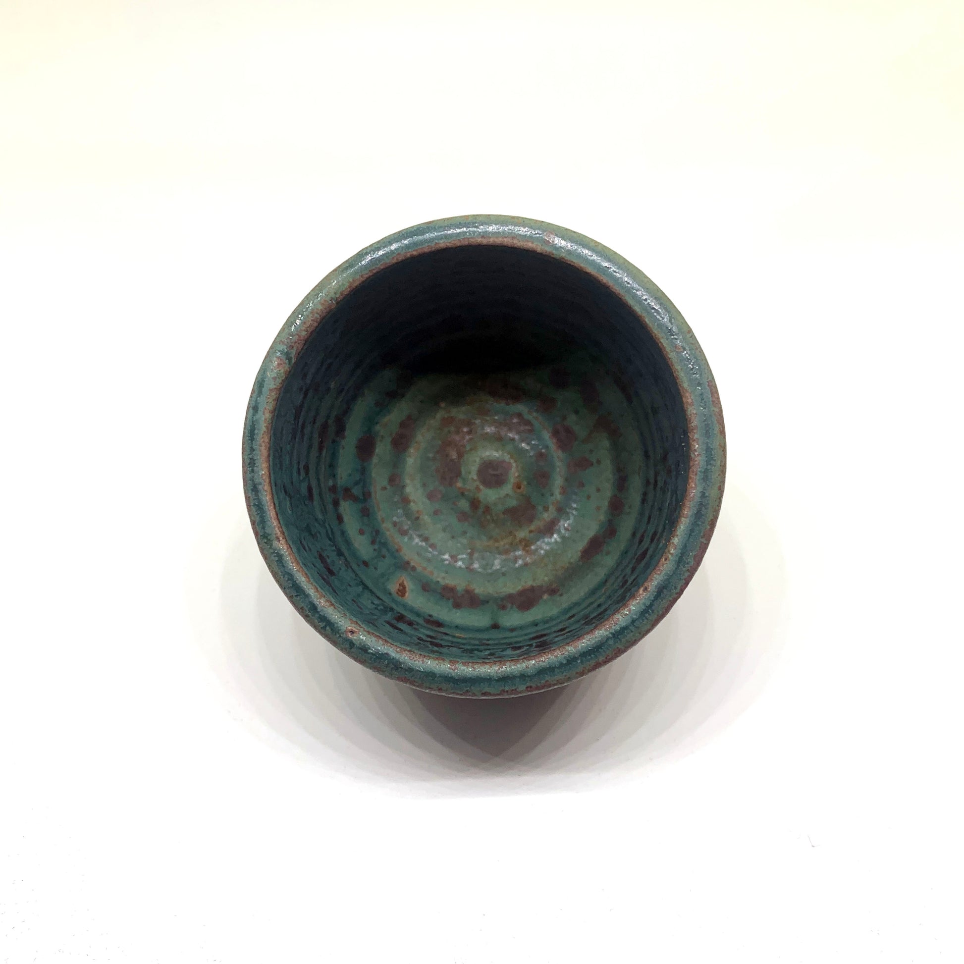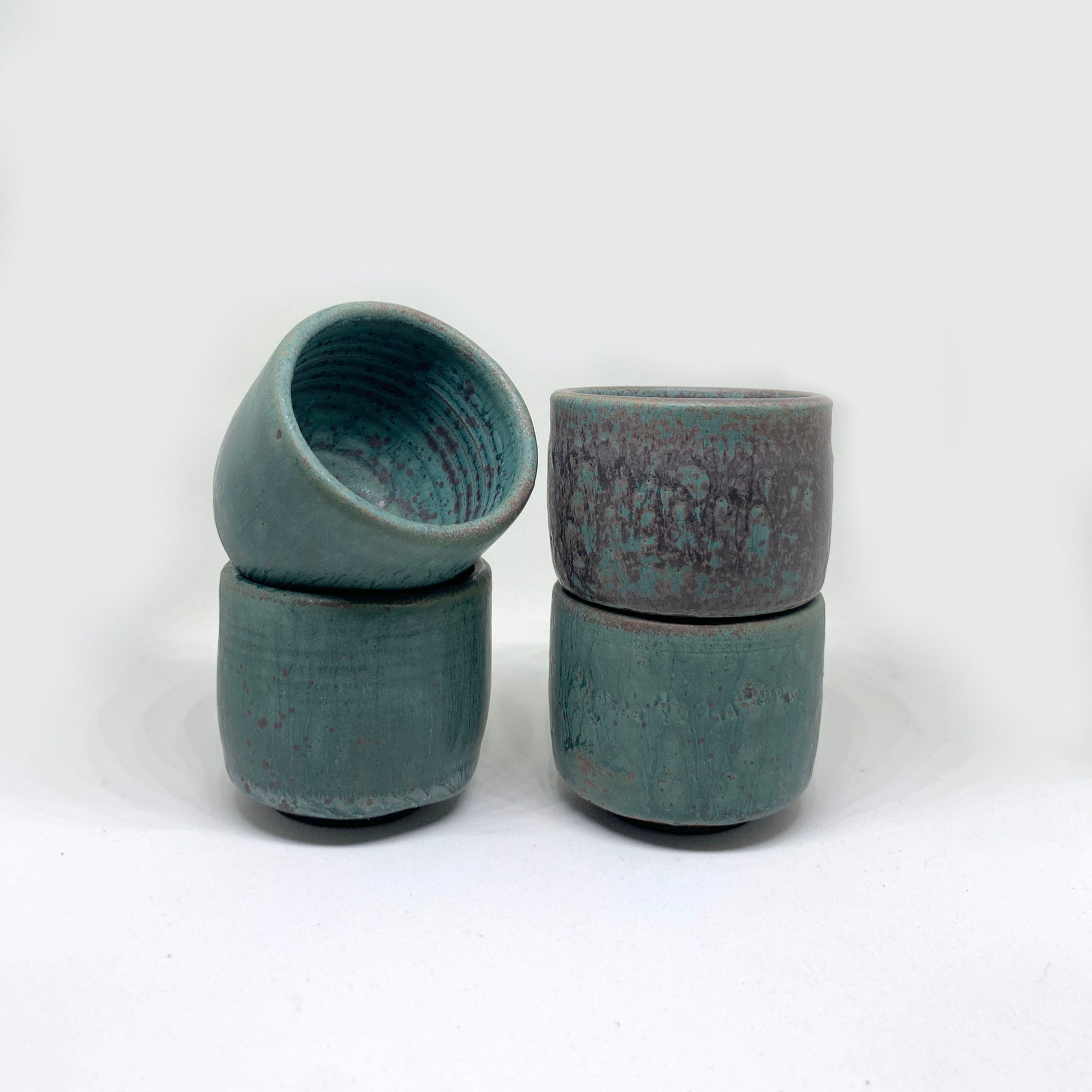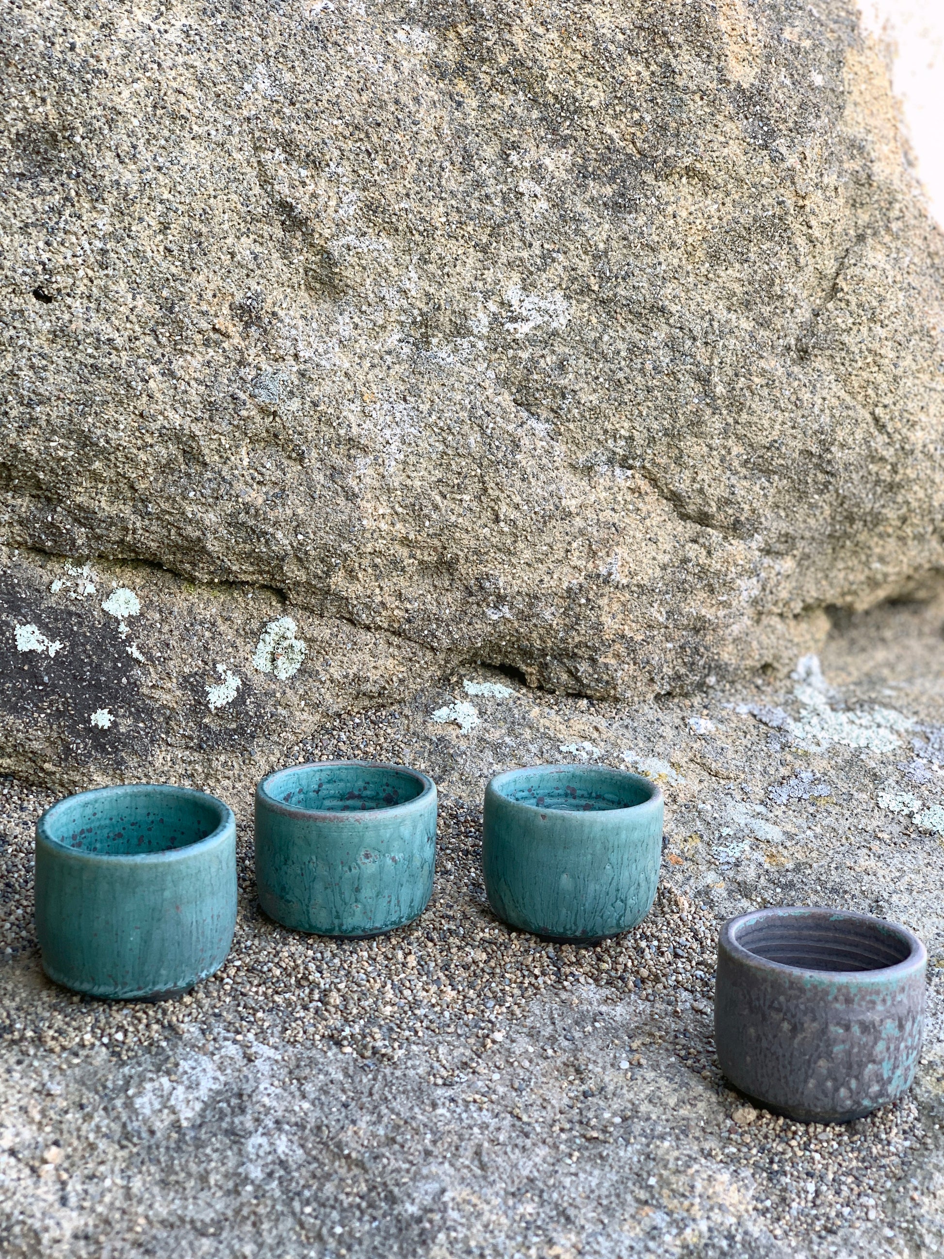 They are a lovely rich green-blue color. One of the cups fired to a darker hue than the others in a kiln blessing. That one is the black sheep of the family. Most families have one of these in them.